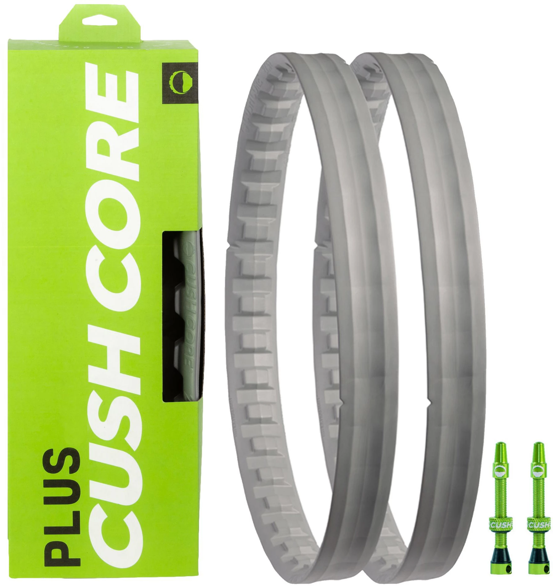 (2) CushCore tyre inserts, (2) 44mm CushCore Presta air valves, valve core tool, installation instructions and rim stickers.