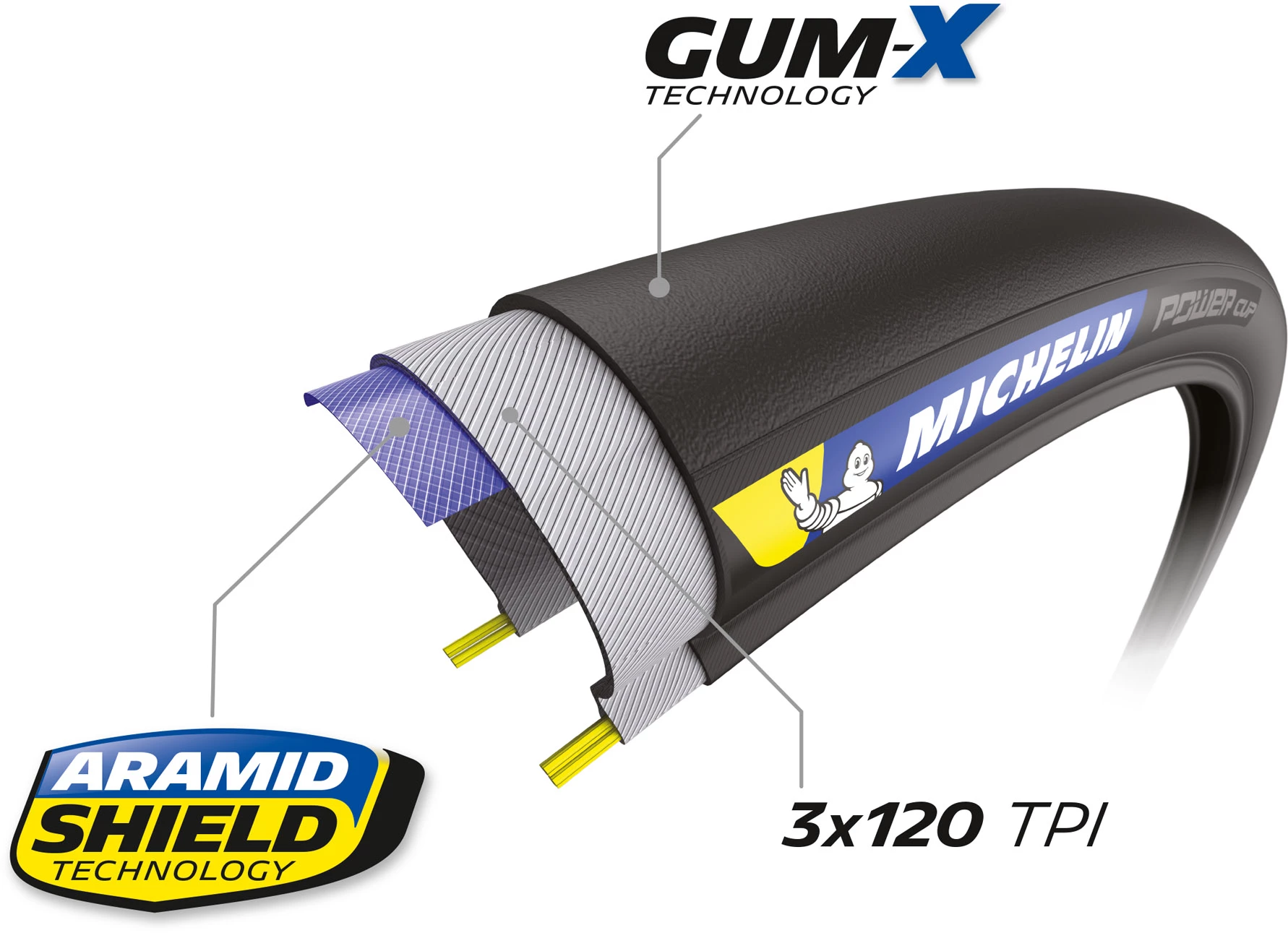 Featuring a dependable Gum-X compound, this clincher-type road bike tyre provides efficient grip, handling and stability in both wet and dry conditions. Michelin has also equipped it with Aramid Shield Technology and 3×120 tpi casing, so you can enjoy its excellent durability as well as its reliable, low weight. With rolling resistance, speed and efficiency that are inspired by the brand’s MotoGP technology, it’s a great companion for everything from training to competing on your road bike. Used by the Cofidis team for riding monuments and Grand Tours, the Michelin Power Cup Competition Tyre TS is performance proven.