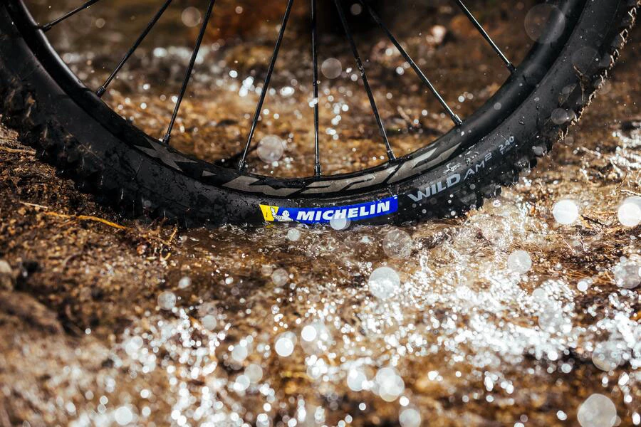 The Michelin Wild AM² has been designed for mixed to softer terrain where its more aggressive tread pattern ensures high levels of grip, but with a reduced focus on rolling efficiency. Tall centre blocks are inspired by those found on the Michelin DH34 tyre and offer a maximum ground penetration during braking for good stability and transfer of braking forces in soft conditions. The shoulder blocks are again inspired by the Michelin DH22 but are modified to increase bite in soft conditions for increased grip, stability and progressive handling in these difficult conditions.