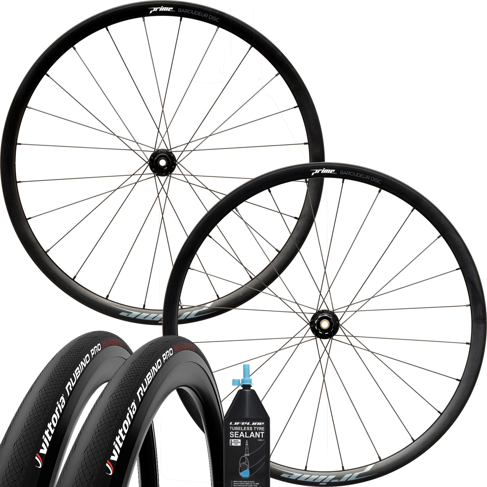 Dieses exklusive Set enthält einen Prime Baroudeur V2 Bremsscheiben Alu Laufradsatz, zwei Vittoria Rubino Pro Tubeless Ready Reifen und ein 150 ml Lifeline-Dichtmittel.