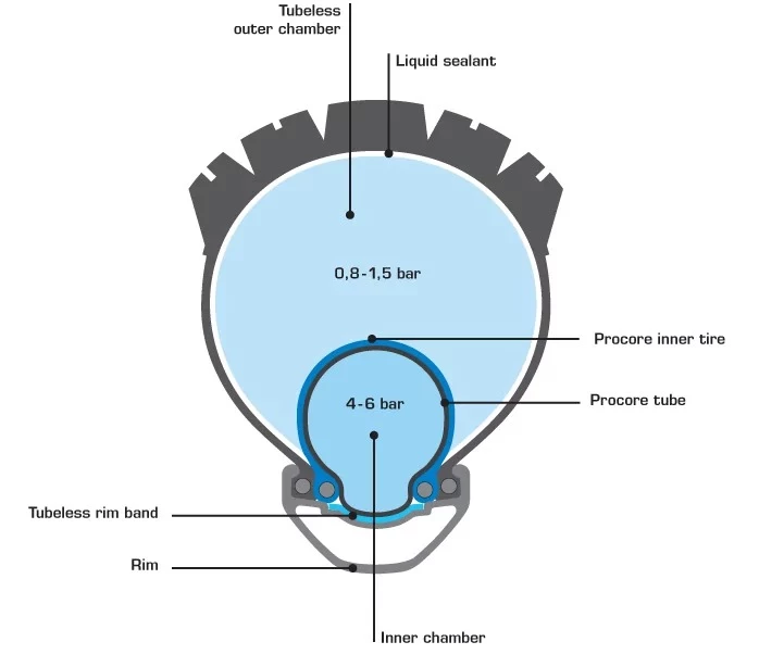 Zwei spezielle Procore-Komponenten bilden die innere Hochdruckkammer: der spezielle Procore-Schlauch und der Procore-Innenreifen. Dieser „Kern“ ist extrem hochdruckstabil und gleichzeitig sehr leicht.